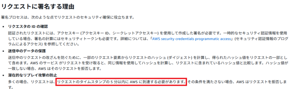 つまり、ローカルPCの時刻が10分遅れていた場合、AWSのAPI側では10分前に受け付けたリクエストだと判断し、